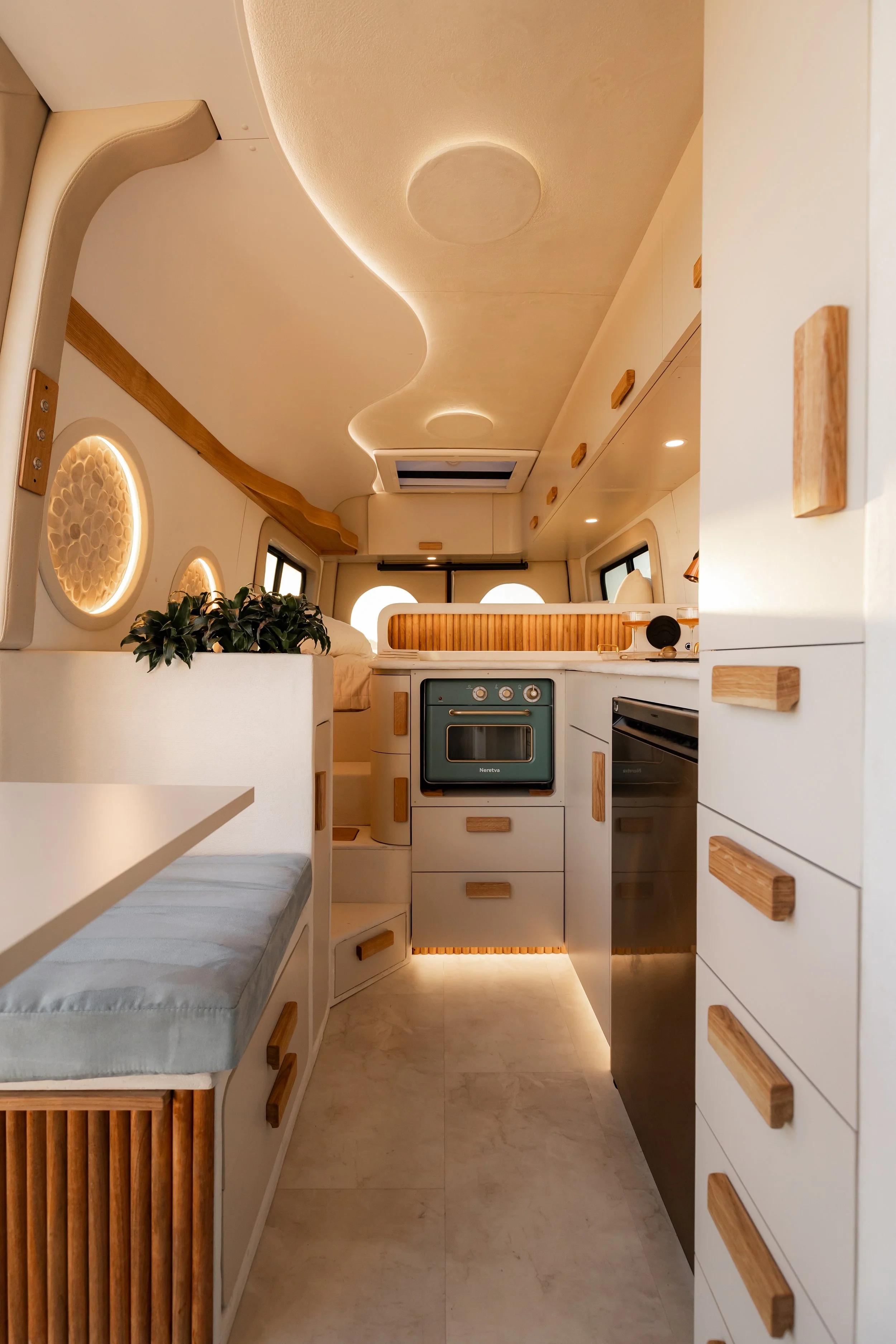 The Luna design has drawn attention for its serene elegance, artistic craftsmanship, and thoughtful details. To meet the growing interest in this build, I’ve partnered with a professional, high-end van-building company to bring Luna to life on a larger scale. This partnership allows me to extend my bandwidth, focusing more on the design process while ensuring each van reflects the same quality, intention, and creativity that define my work.